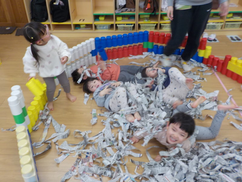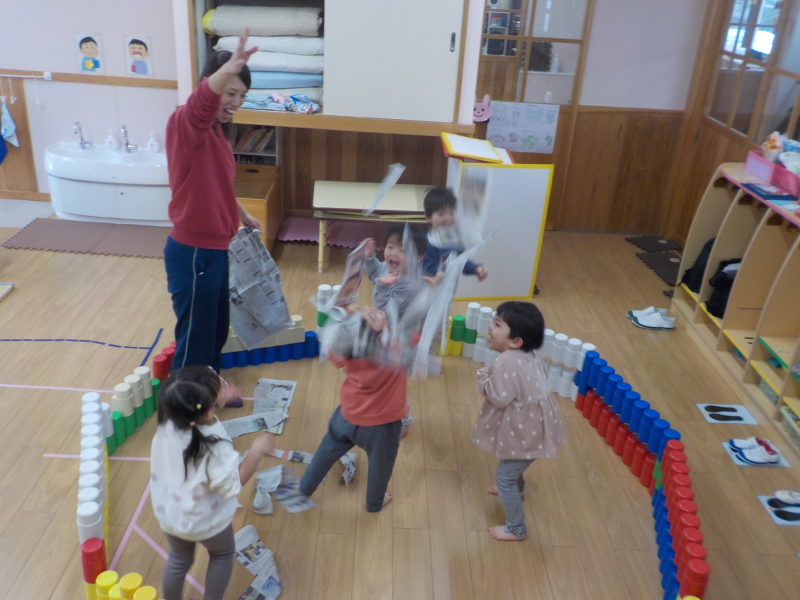 【2才児・いちご組】お外はとっても寒いから、今日はお部屋で新聞遊び!!ちぎった新聞ひらひらひら~! わーい💕