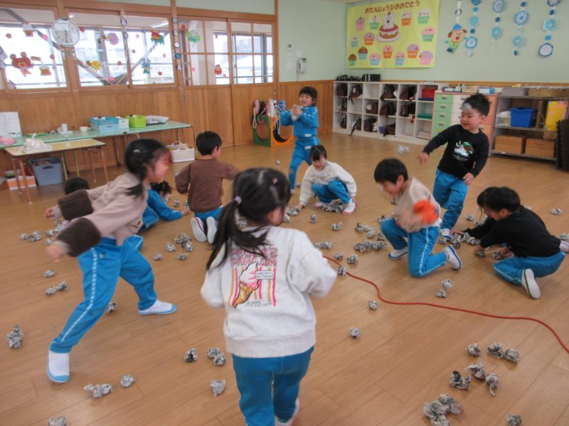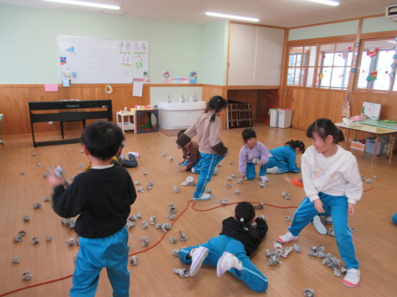 【4才児・ひまわり組】こちらも節分に向けて、新聞豆を作りました👹