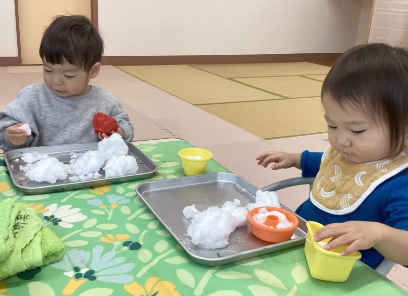 【0才児どんぐり 1才児・ひよこ組】こんもりフワフワの雪を持ってきて、、お部屋での雪あそび第二弾!!