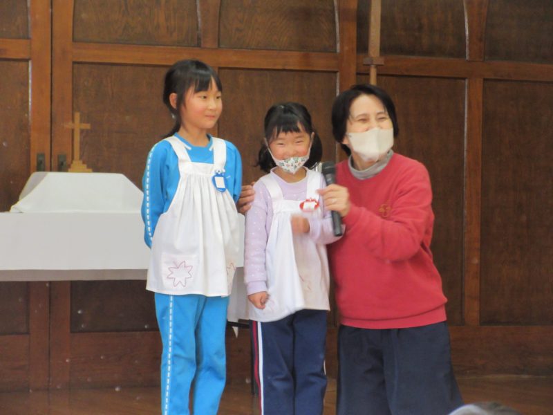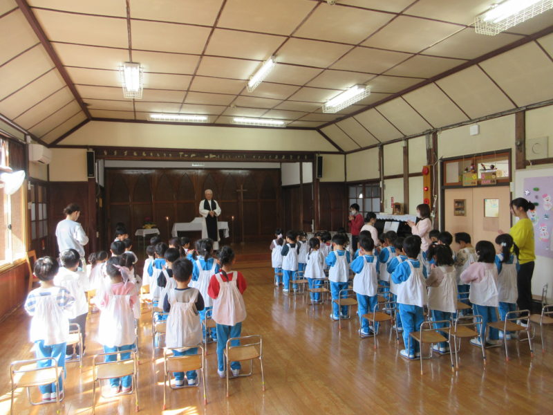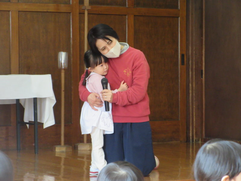 【いっしょ礼拝】2~5才児がホールに集まり礼拝をしました。