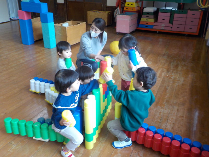 【2才児・いちご組】ホールで遊んだよ。一人ひとりブロックで車を作って大喜び😁🚗