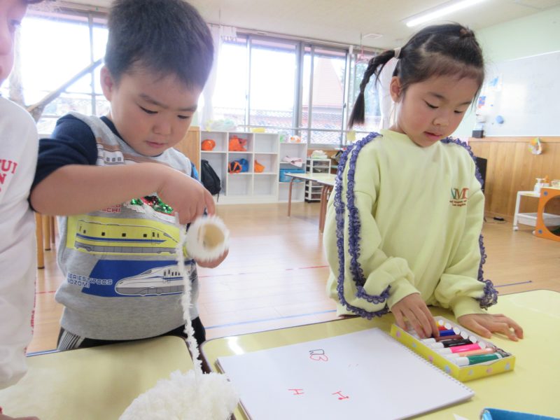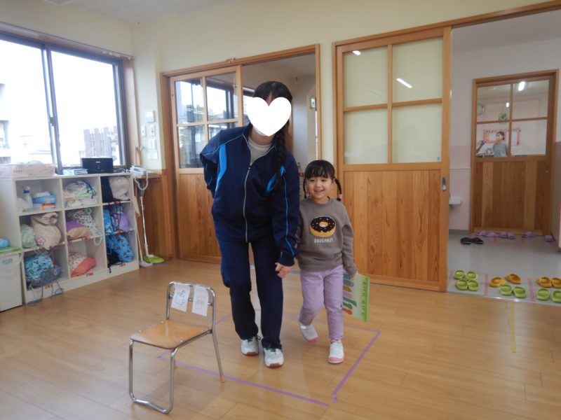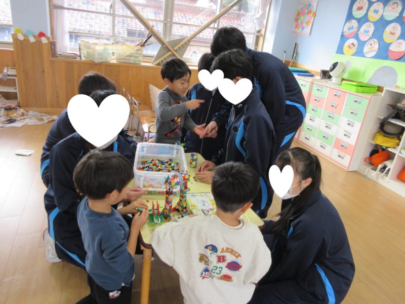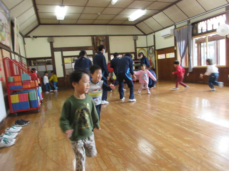 気温が上がらずとても寒い日でしたね。今日は、附属中学校の生徒さんが来園し、一緒に遊びました。遊んだ後のお部屋やホールでの活動も、ご紹介します☺