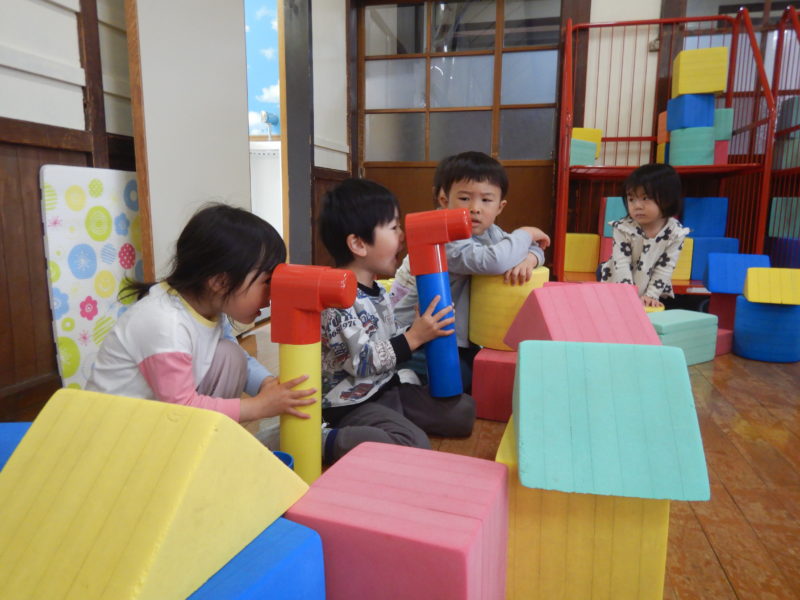 【3才児・さくらんぼ組】ホールのソフト積み木を並べて海賊船🌊 望遠鏡からは何が見えたかな?👀✨