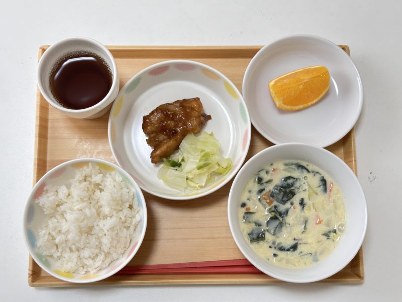 ごはん、鶏肉のレモン煮、キャベツ、豆乳スープ、オレンジ
