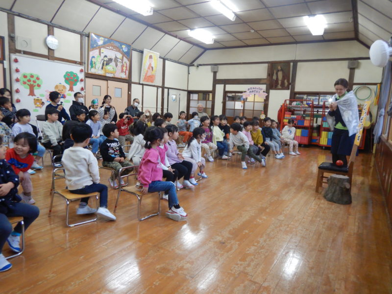 【先生からのお楽しみ】絵本「どうぞのいす」を題材に先生たちで劇を披露🎵様々なものを椅子の上に置き、物を交換しました😊
