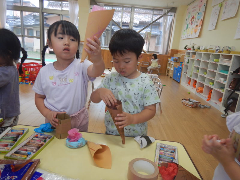 他にも看板を作りたい!お店屋さんの服が欲しい!もっと食べ物がいる!と日々遊びは変化していきます。フリー参観では子どもたちと一緒に遊びながらお楽しみください✨