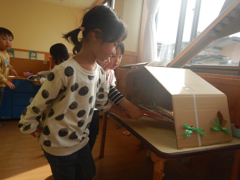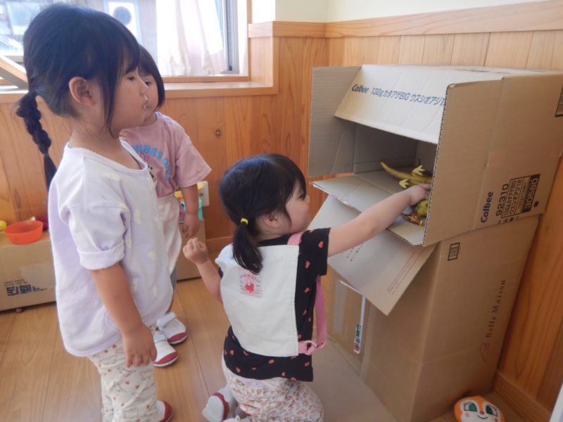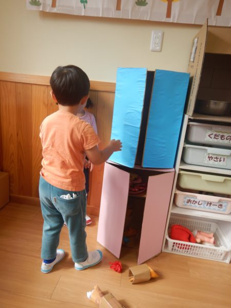 食べ物を作ってみたのはいいけど片付ける場所がない!という問題も発生。お部屋にあった段ボールにおもちゃを入れている子を見て「冷蔵庫も作ればいいんじゃない?」