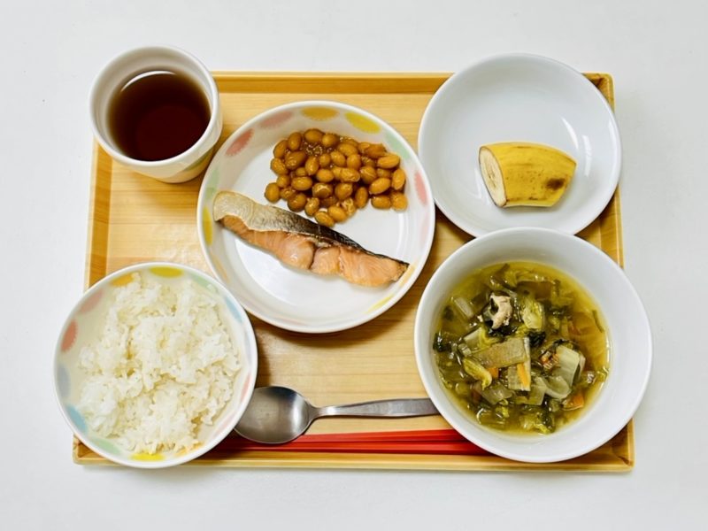 七草がゆ風ぞうすい、焼き魚、大豆の油みそ、バナナ