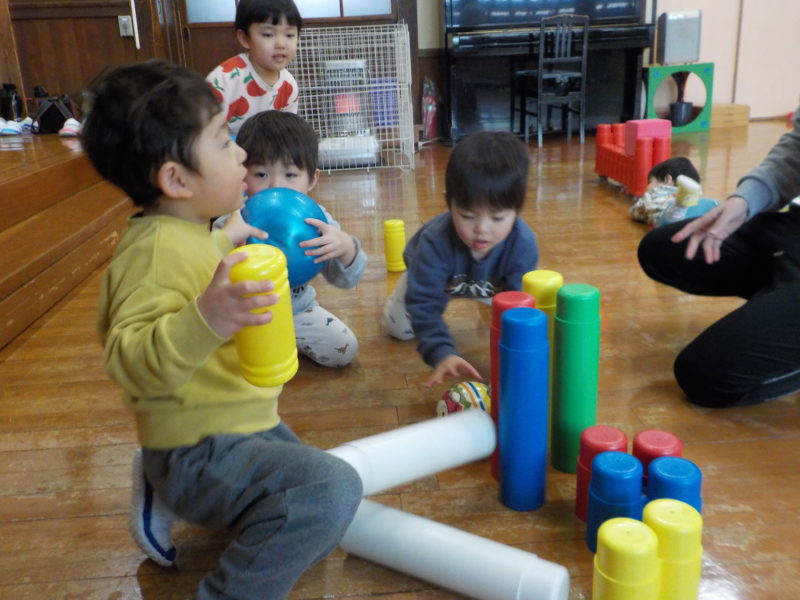 【2才児・いちご組】ホールでたくさん遊びました♪ブロックを並べてボールをコロコロ~~♪ボーリング遊びで盛り上がりました!!