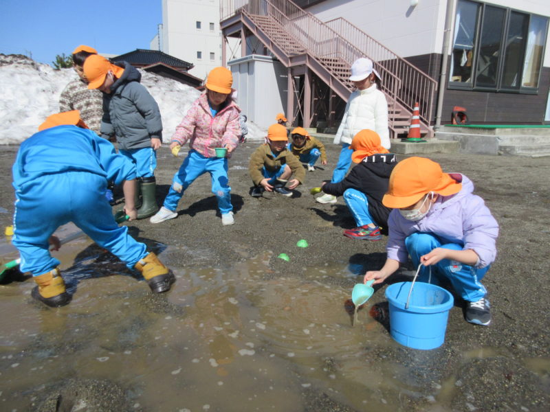 暖かいお天気で、園庭の雪がどんどん解けています。園での雪あそびは、先週で終了しましたが、今週は身軽な格好でお外遊びが出来そうです♪