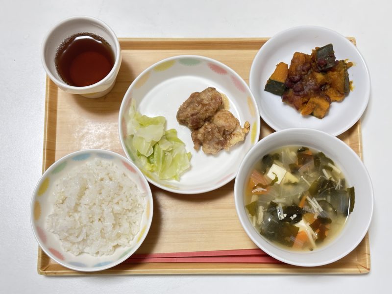 7分つきごはん、鶏肉のゆずソース、キャベツ、たまねぎとえのきのみそ汁、かぼちゃのいとこ煮