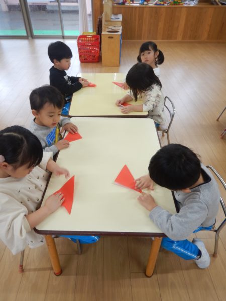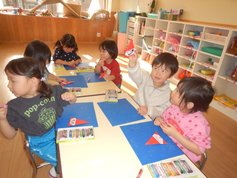 【3才児・さくらんぼ組】クリスマスの制作をしました!折り紙でサンタさんを作りましたよ🎅