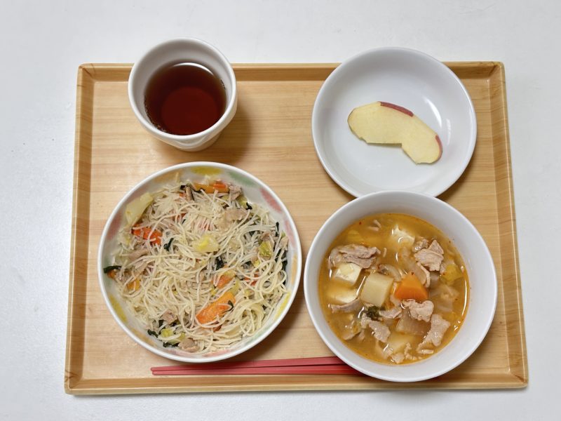 ビーフンソテー、キムチ豚汁、りんご