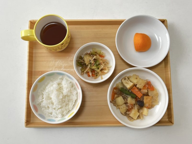 7分つきごはん、じゃがいものそぼろ煮、キャベツのおかか和え、みかん