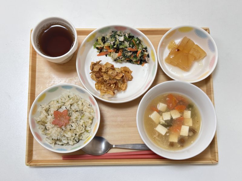 のり酢和え、なめこの味噌汁、焼きりんごゼリー