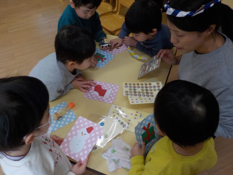 【2才児・いちご組】先生からのクリスマスカードにかわいいシールを貼ったよ😊何を貼ろうか迷っちゃうね♡