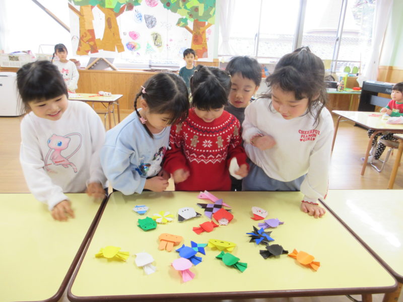 先生からのプレゼントでかわいい折り紙をもらいました!プレゼントがいっぱいで嬉しいね!
