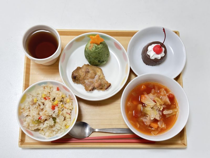 クリスマスピラフ、ローストチキン、ツリーサラダ、ミネストローネ、豆乳ココアプリン