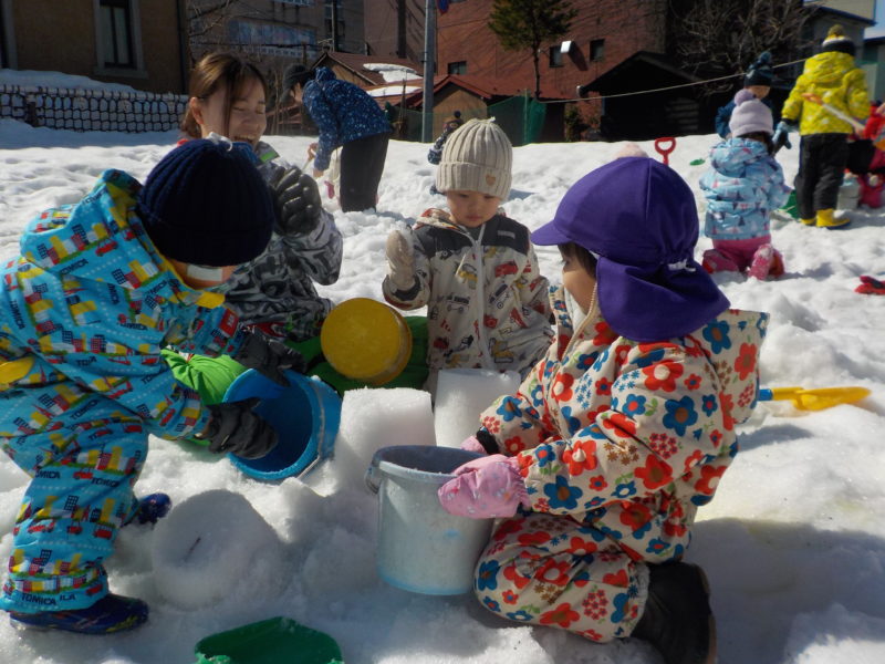 お天気の良かった今日は、2クラス一緒に雪遊びを楽しみました!雪遊びの後は、汗をかくほど暑かったね!! 【2才児・いちご組 3才児・さくらんぼ組】 【今日の給食】